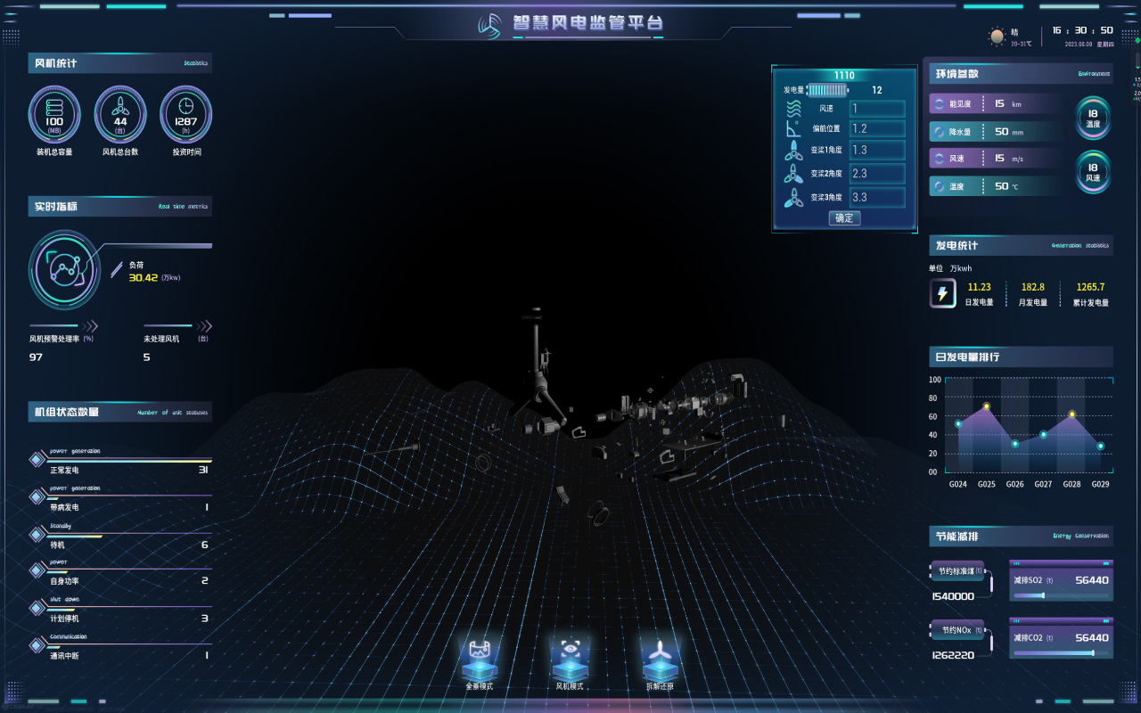 以霖尚ME数字孪生底座驱动,实时呈现风力发电风机的各项监测参数和风电场的运维状态。通过PLC采集的实时数据驱动数字孪生对风机进行直观的展示,通过图形、表格和数据报告的方式展现不同场所的实时数据。